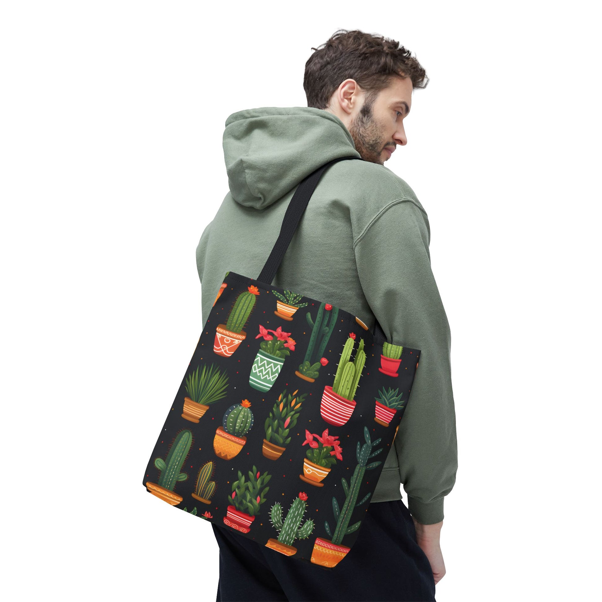 Celebrate your love for cacti with our cactus pattern tote bag. Featuring vibrant cactus designs inspired by the southwest deserts, this reusable bag is perfect for farmers market shopping or everyday grocery runs. It's also an ideal destination wedding gift or a thoughtful present for cactus lovers. Whether you're planning an Arizona or desert vacation or just need a stylish tote, this bag combines practicality with a touch of nature. Perfect for carrying your essentials, this eco-friendly bag is both versatile and durable.