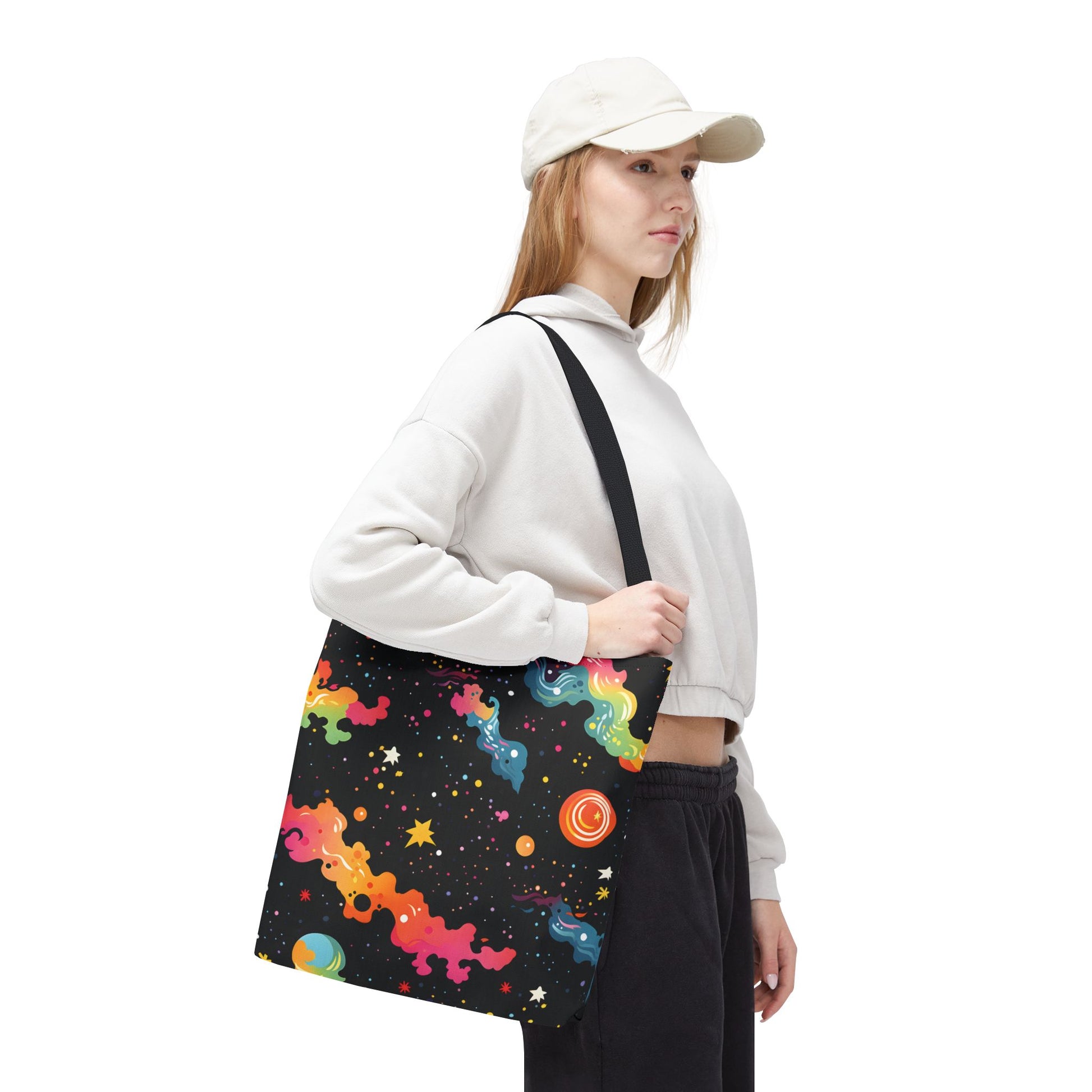 Discover the cosmos with our colorful space themed tote bags! Featuring vibrant galaxy and night sky patterns, this bag features celestial and trippy designs that showcase the cosmos in a fashionable manner. Use this tote as a reusable grocery bag, your childs daycare and book bag, or as a fun accessory to carry wherever you go. These make the perfect gift for anyone who loves space or bright colors.