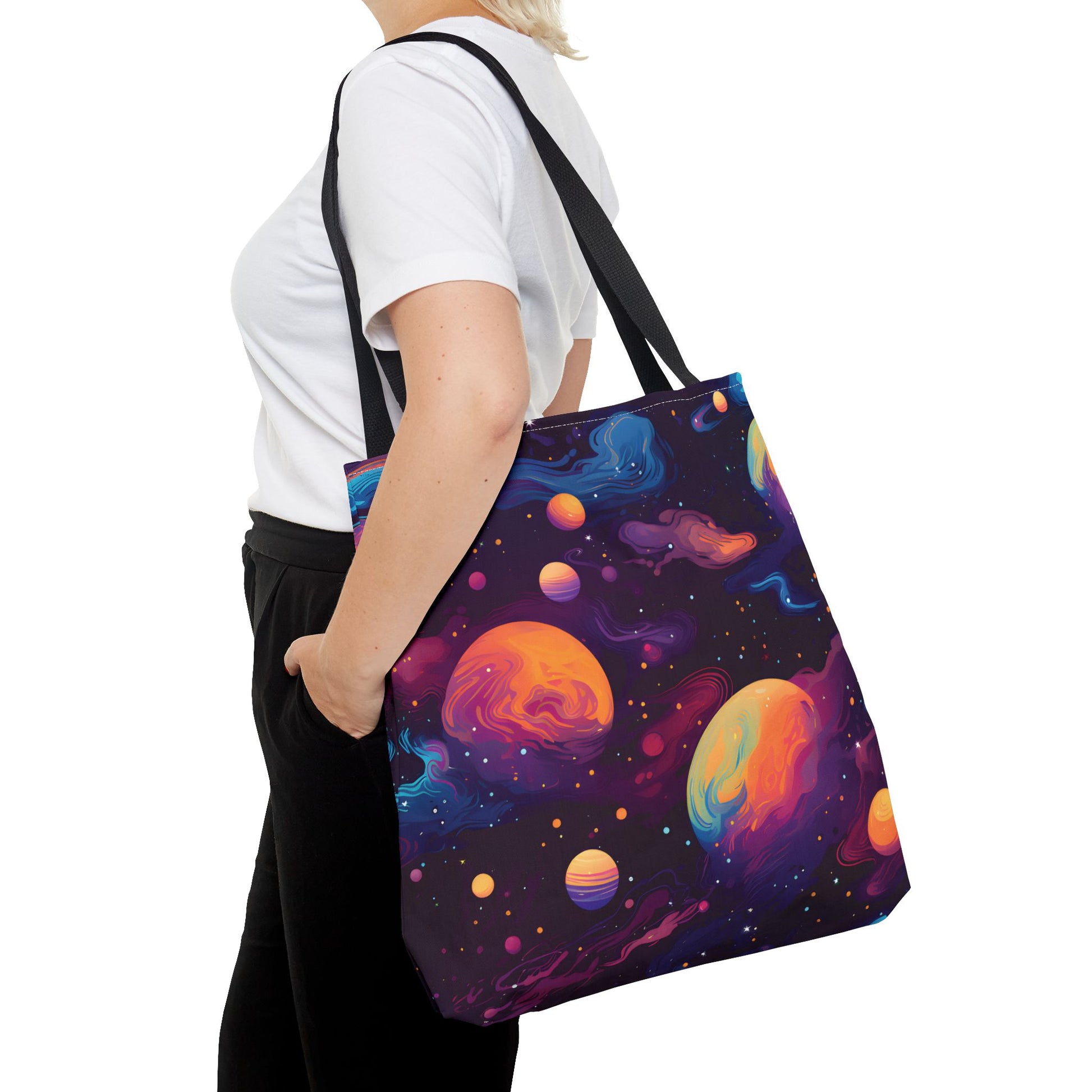 Explore the universe with our space pattern tote bag! Showcasing a solar system design with galaxy and night sky patterns, this tote features celestial and cosmos-inspired elements. Perfect as a reusable shopping bag, your child’s daycare book bag, or a fun accessory for any space lover. This bag is an ideal gift for those who appreciate the wonders of the galaxy.