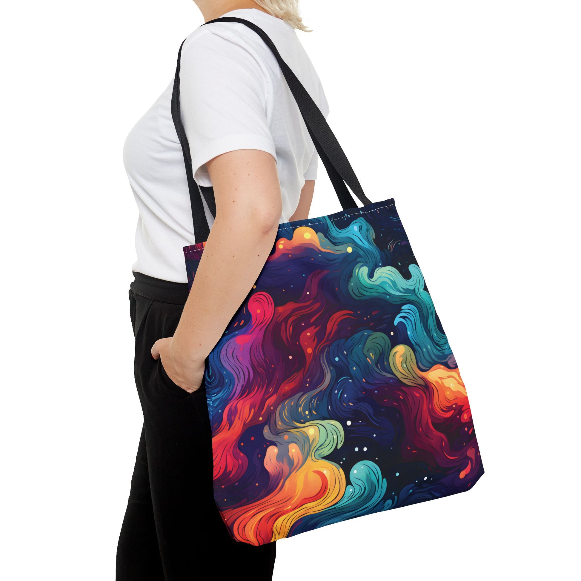 Explore the universe with our space pattern tote bag! Showcasing a solar system design with galaxy and night sky patterns, this tote features celestial and cosmos-inspired elements. Perfect as a reusable shopping bag, your child’s daycare book bag, or a fun accessory for any space lover. This bag is an ideal gift for those who appreciate the wonders of the galaxy.