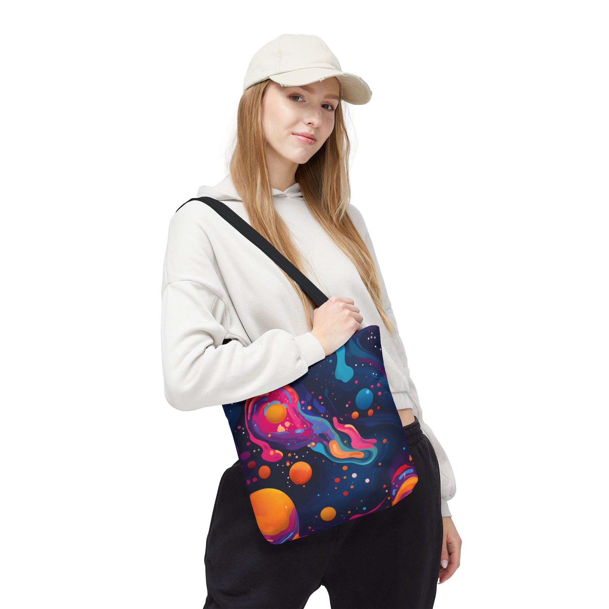 Explore the universe with our space pattern tote bag! Showcasing a solar system design with galaxy and night sky patterns, this tote features celestial and cosmos-inspired elements. Perfect as a reusable shopping bag, your child’s daycare book bag, or a fun accessory for any space lover. This bag is an ideal gift for those who appreciate the wonders of the galaxy.