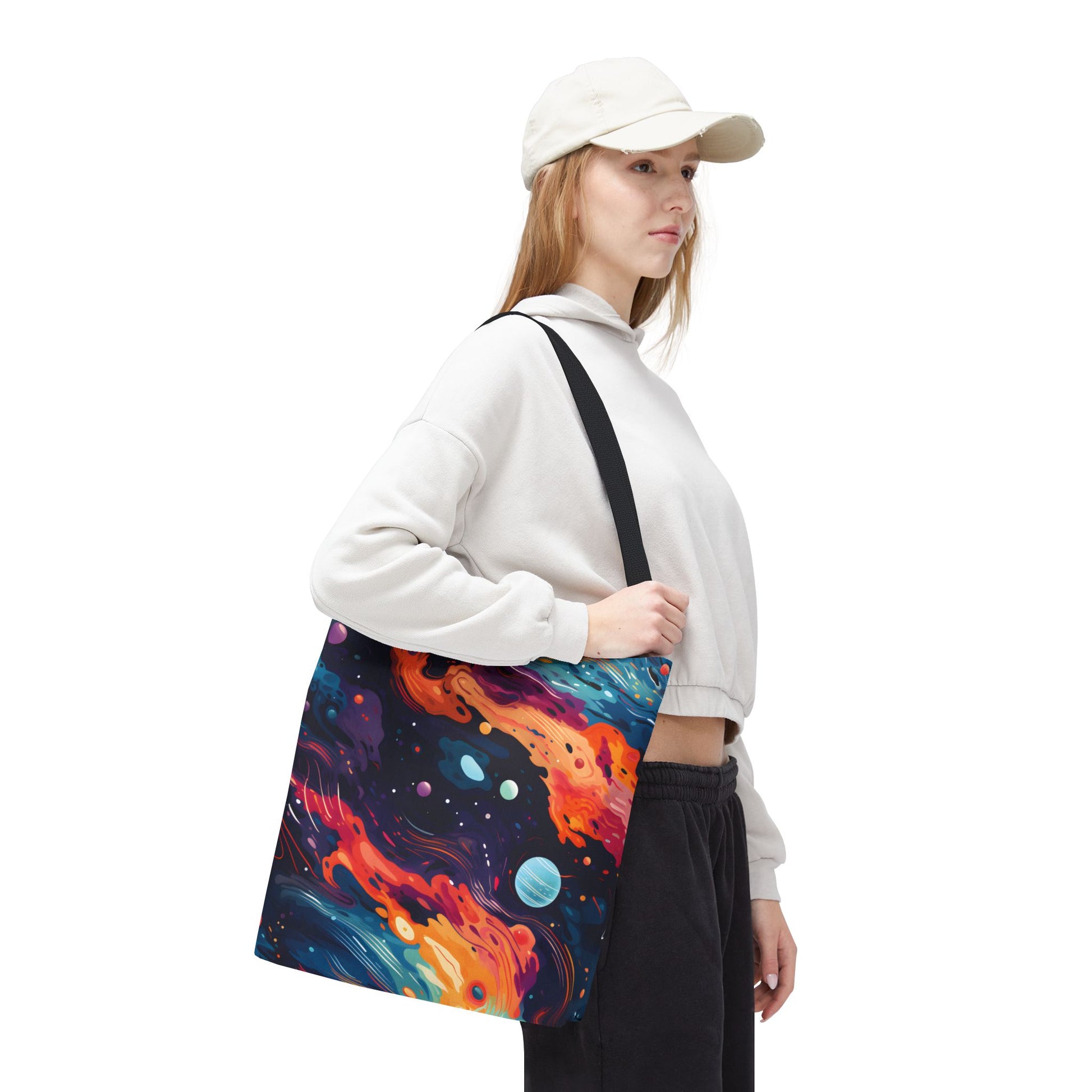 Explore the universe with our space pattern tote bag! Showcasing a solar system design with galaxy and night sky patterns, this tote features celestial and cosmos-inspired elements. Perfect as a reusable shopping bag, your child’s daycare book bag, or a fun accessory for any space lover. This bag is an ideal gift for those who appreciate the wonders of the galaxy.