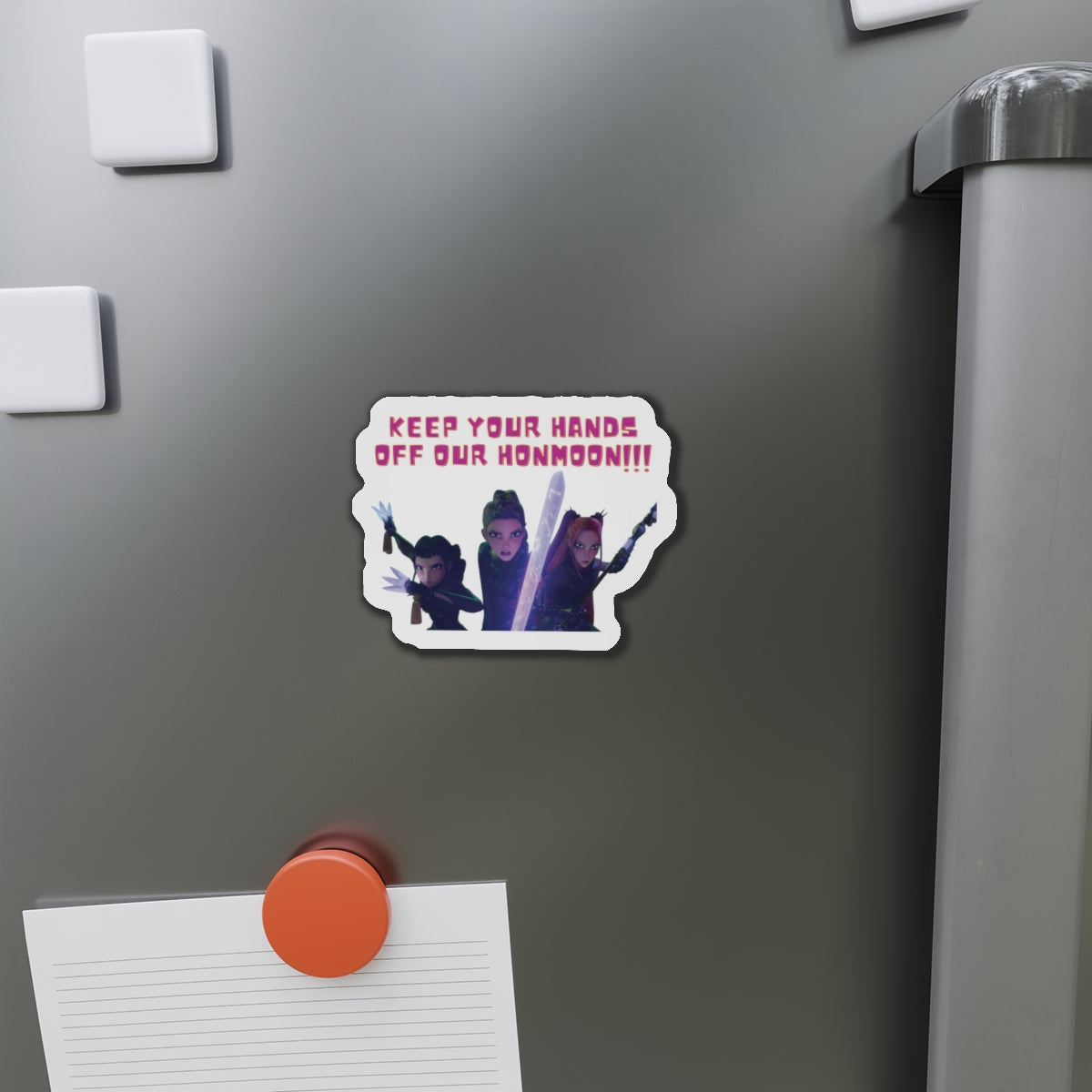 Show off your love for Kpops newest girl group sensation, Huntrix, with this stylish magnet! This Kpop Demon Hunters merch makes an ideal gift for Huntrix fans. Celebrate Rumi, Mira, and Zoeys global group success by using this as a car magnet, fridge magnet, whiteboard magnet, school locker magnet or any magnetic surface. Add this to your growing kpop collection and help keep the Honmoon strong!