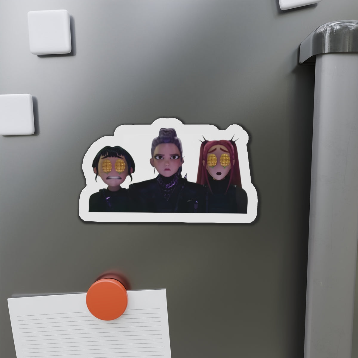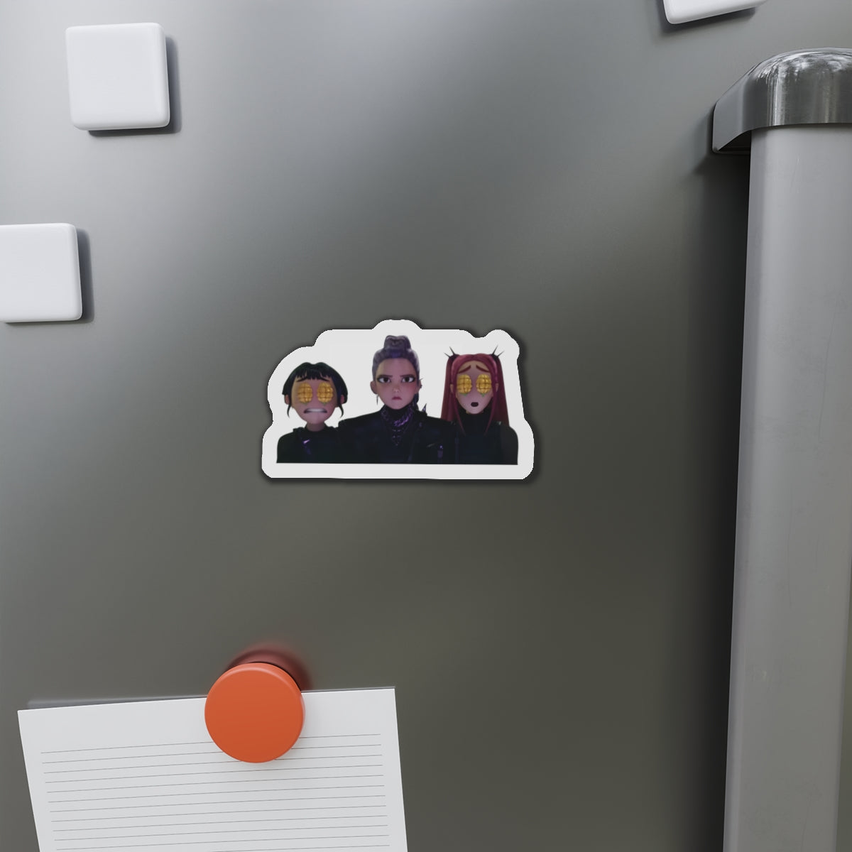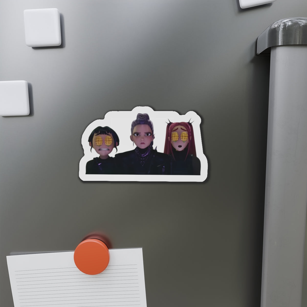 Show off your love for Kpops newest girl group sensation, Huntrix, with this stylish magnet! This Kpop Demon Hunters merch makes an ideal gift for Huntrix fans. Celebrate Rumi, Mira, and Zoeys global group success by using this as a car magnet, fridge magnet, whiteboard magnet, school locker magnet or any magnetic surface. Add this to your growing kpop collection and help keep the Honmoon strong!
