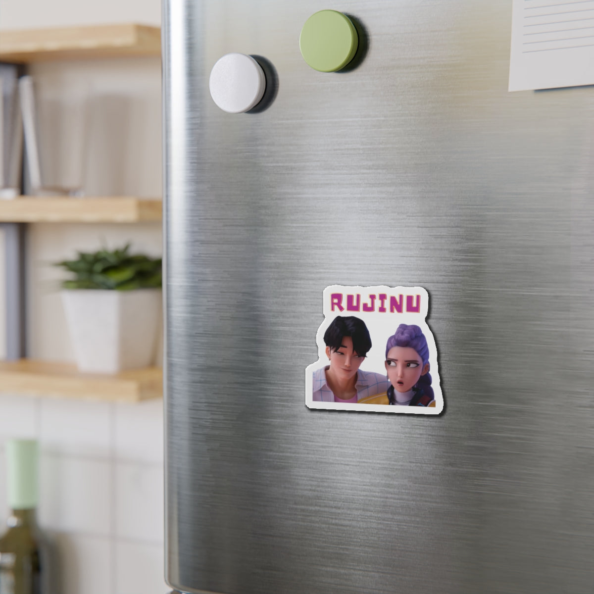Show off your love for Kpops newest girl group sensation, Huntrix, with this stylish magnet! This Kpop Demon Hunters merch makes a great gift for lovers of the movie. Celebrate the Rumi and Jinu ship, Rujinu, by using this as a car magnet, fridge magnet, whiteboard magnet, school locker magnet or any magnetic surface. Add this to your growing kpop collection and help keep the Honmoon strong!